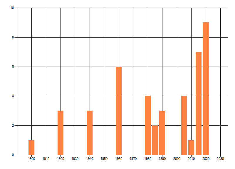 Het aantal atlasblokken (5x5 km) waarin de soort is gemeld binnen een periode van vijf jaar (vanaf 1980) of twintig jaar. Niet gecorrigeerd voor waarnemersinspanning en het aantal doorgegeven waarnemingen kan sterk variëren per periode, dus een trend in verspreiding kan hier niet direct uit worden afgelezen. Het opgegeven jaartal is het eerste jaar van de periode. Bron: gevalideerde waarnemingen uit de NDFF.
