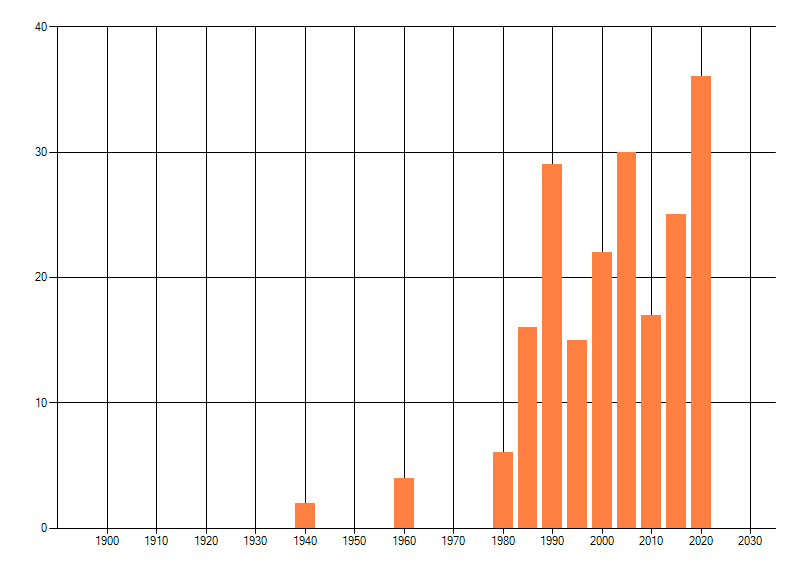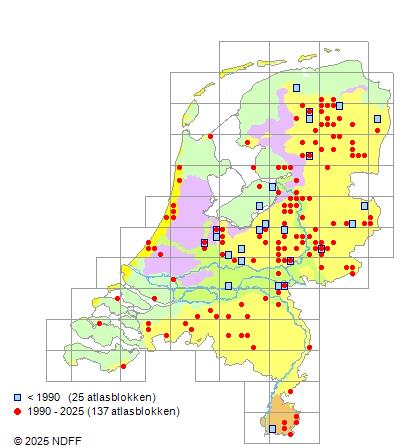 Het aantal atlasblokken (5x5 km) waarin de soort is gemeld binnen een periode van vijf jaar (vanaf 1980) of twintig jaar. Niet gecorrigeerd voor waarnemersinspanning en het aantal doorgegeven waarnemingen kan sterk variëren per periode, dus een trend in verspreiding kan hier niet direct uit worden afgelezen. Het opgegeven jaartal is het eerste jaar van de periode. Bron: gevalideerde waarnemingen uit de NDFF.