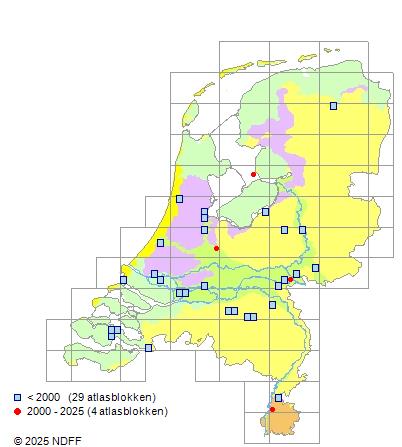 Het aantal atlasblokken (5x5 km) waarin de soort is gemeld binnen een periode van vijf jaar (vanaf 1980) of twintig jaar. Niet gecorrigeerd voor waarnemersinspanning en het aantal doorgegeven waarnemingen kan sterk variëren per periode, dus een trend in verspreiding kan hier niet direct uit worden afgelezen. Het opgegeven jaartal is het eerste jaar van de periode. Bron: gevalideerde waarnemingen uit de NDFF.