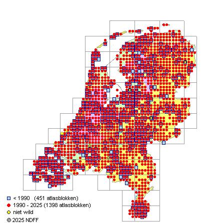 Het aantal atlasblokken (5x5 km) waarin de soort is gemeld binnen een periode van vijf jaar (vanaf 1980) of twintig jaar.