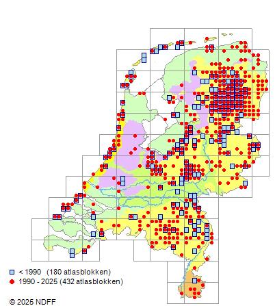 Het aantal atlasblokken (5x5 km) waarin de soort is gemeld binnen een periode van vijf jaar (vanaf 1980) of twintig jaar. Niet gecorrigeerd voor waarnemersinspanning en het aantal doorgegeven waarnemingen kan sterk variëren per periode, dus een trend in verspreiding kan hier niet direct uit worden afgelezen. Het opgegeven jaartal is het eerste jaar van de periode. Bron: gevalideerde waarnemingen uit de NDFF.