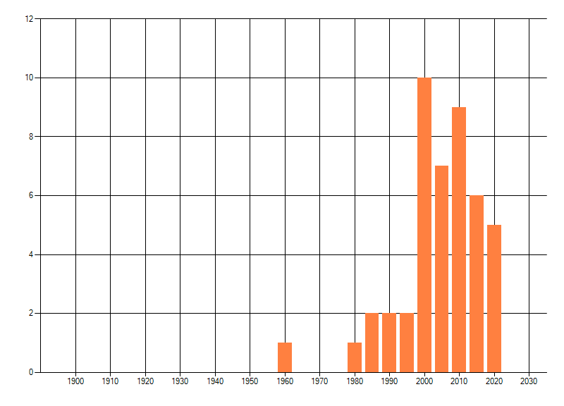 Het aantal atlasblokken (5x5 km) waarin de soort is gemeld binnen een periode van vijf jaar (vanaf 1980) of twintig jaar. Niet gecorrigeerd voor waarnemersinspanning en het aantal doorgegeven waarnemingen kan sterk variëren per periode, dus een trend in verspreiding kan hier niet direct uit worden afgelezen. Het opgegeven jaartal is het eerste jaar van de periode. Bron: gevalideerde waarnemingen uit de NDFF.