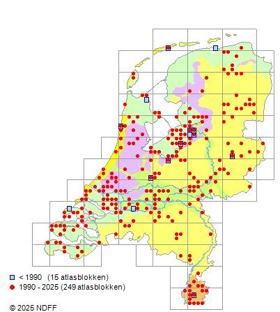 Het aantal atlasblokken (5x5 km) waarin de soort is gemeld binnen een periode van vijf jaar (vanaf 1980) of twintig jaar. Niet gecorrigeerd voor waarnemersinspanning en het aantal doorgegeven waarnemingen kan sterk variëren per periode, dus een trend in verspreiding kan hier niet direct uit worden afgelezen. Het opgegeven jaartal is het eerste jaar van de periode. Bron: gevalideerde waarnemingen uit de NDFF.