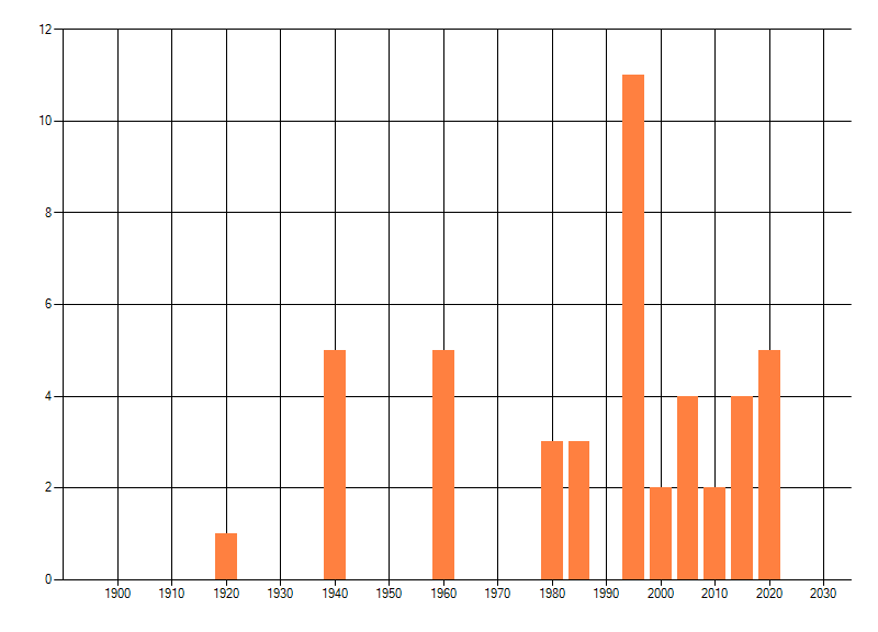 Het aantal atlasblokken (5x5 km) waarin de soort is gemeld binnen een periode van vijf jaar (vanaf 1980) of twintig jaar. Niet gecorrigeerd voor waarnemersinspanning en het aantal doorgegeven waarnemingen kan sterk variëren per periode, dus een trend in verspreiding kan hier niet direct uit worden afgelezen. Het opgegeven jaartal is het eerste jaar van de periode. Bron: gevalideerde waarnemingen uit de NDFF.