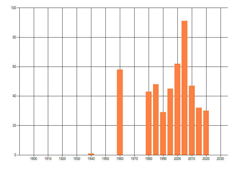 Het aantal atlasblokken (5x5 km) waarin de soort is gemeld binnen een periode van vijf jaar (vanaf 1980) of twintig jaar. Niet gecorrigeerd voor waarnemersinspanning en het aantal doorgegeven waarnemingen kan sterk variëren per periode, dus een trend in verspreiding kan hier niet direct uit worden afgelezen. Het opgegeven jaartal is het eerste jaar van de periode. Bron: gevalideerde waarnemingen uit de NDFF.