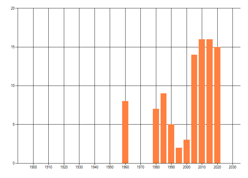 Het aantal atlasblokken (5x5 km) waarin de soort is gemeld binnen een periode van vijf jaar (vanaf 1980) of twintig jaar. Niet gecorrigeerd voor waarnemersinspanning en het aantal doorgegeven waarnemingen kan sterk variëren per periode, dus een trend in verspreiding kan hier niet direct uit worden afgelezen. Het opgegeven jaartal is het eerste jaar van de periode. Bron: gevalideerde waarnemingen uit de NDFF.