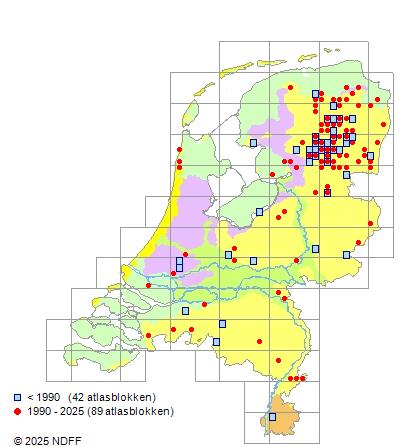 Het aantal atlasblokken (5x5 km) waarin de soort is gemeld binnen een periode van vijf jaar (vanaf 1980) of twintig jaar. Niet gecorrigeerd voor waarnemersinspanning en het aantal doorgegeven waarnemingen kan sterk variëren per periode, dus een trend in verspreiding kan hier niet direct uit worden afgelezen. Het opgegeven jaartal is het eerste jaar van de periode. Bron: gevalideerde waarnemingen uit de NDFF.