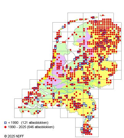 Het aantal atlasblokken (5x5 km) waarin de soort is gemeld binnen een periode van vijf jaar (vanaf 1980) of twintig jaar. Niet gecorrigeerd voor waarnemersinspanning en het aantal doorgegeven waarnemingen kan sterk variëren per periode, dus een trend in verspreiding kan hier niet direct uit worden afgelezen. Het opgegeven jaartal is het eerste jaar van de periode. Bron: gevalideerde waarnemingen uit de NDFF.