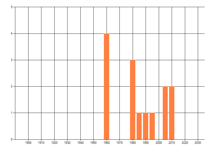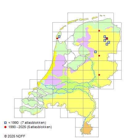 Het aantal atlasblokken (5x5 km) waarin de soort is gemeld binnen een periode van vijf jaar (vanaf 1980) of twintig jaar. Niet gecorrigeerd voor waarnemersinspanning en het aantal doorgegeven waarnemingen kan sterk variëren per periode, dus een trend in verspreiding kan hier niet direct uit worden afgelezen. Het opgegeven jaartal is het eerste jaar van de periode. Bron: gevalideerde waarnemingen uit de NDFF.