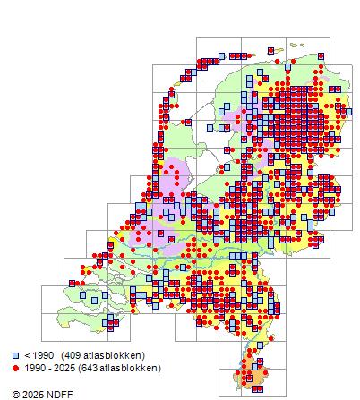 Het aantal atlasblokken (5x5 km) waarin de soort is gemeld binnen een periode van vijf jaar (vanaf 1980) of twintig jaar. Niet gecorrigeerd voor waarnemersinspanning en het aantal doorgegeven waarnemingen kan sterk variëren per periode, dus een trend in verspreiding kan hier niet direct uit worden afgelezen. Het opgegeven jaartal is het eerste jaar van de periode. Bron: gevalideerde waarnemingen uit de NDFF.