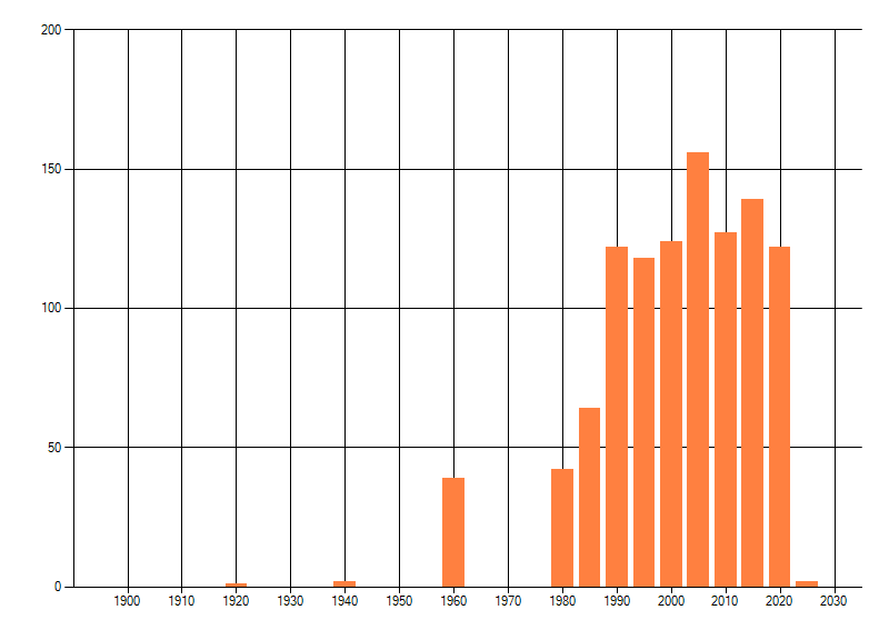 Het aantal atlasblokken (5x5 km) waarin de soort is gemeld binnen een periode van vijf jaar (vanaf 1980) of twintig jaar. Niet gecorrigeerd voor waarnemersinspanning en het aantal doorgegeven waarnemingen kan sterk variëren per periode, dus een trend in verspreiding kan hier niet direct uit worden afgelezen. Het opgegeven jaartal is het eerste jaar van de periode. Bron: gevalideerde waarnemingen uit de NDFF.