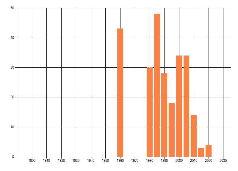 Het aantal atlasblokken (5x5 km) waarin de soort is gemeld binnen een periode van vijf jaar (vanaf 1980) of twintig jaar. Niet gecorrigeerd voor waarnemersinspanning en het aantal doorgegeven waarnemingen kan sterk variëren per periode, dus een trend in verspreiding kan hier niet direct uit worden afgelezen. Het opgegeven jaartal is het eerste jaar van de periode. Bron: gevalideerde waarnemingen uit de NDFF.