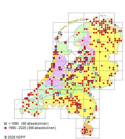 Het aantal atlasblokken (5x5 km) waarin de soort is gemeld binnen een periode van vijf jaar (vanaf 1980) of twintig jaar. Niet gecorrigeerd voor waarnemersinspanning en het aantal doorgegeven waarnemingen kan sterk variëren per periode, dus een trend in verspreiding kan hier niet direct uit worden afgelezen. Het opgegeven jaartal is het eerste jaar van de periode. Bron: gevalideerde waarnemingen uit de NDFF.