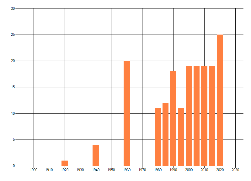 Het aantal atlasblokken (5x5 km) waarin de soort is gemeld binnen een periode van vijf jaar (vanaf 1980) of twintig jaar. Niet gecorrigeerd voor waarnemersinspanning en het aantal doorgegeven waarnemingen kan sterk variëren per periode, dus een trend in verspreiding kan hier niet direct uit worden afgelezen. Het opgegeven jaartal is het eerste jaar van de periode. Bron: gevalideerde waarnemingen uit de NDFF.