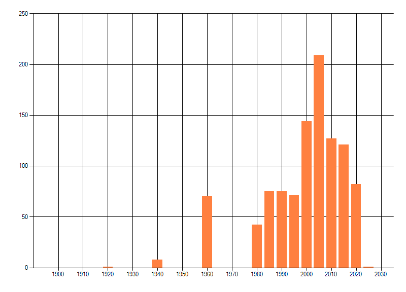 Het aantal atlasblokken (5x5 km) waarin de soort is gemeld binnen een periode van vijf jaar (vanaf 1980) of twintig jaar. Niet gecorrigeerd voor waarnemersinspanning en het aantal doorgegeven waarnemingen kan sterk variëren per periode, dus een trend in verspreiding kan hier niet direct uit worden afgelezen. Het opgegeven jaartal is het eerste jaar van de periode. Bron: gevalideerde waarnemingen uit de NDFF.