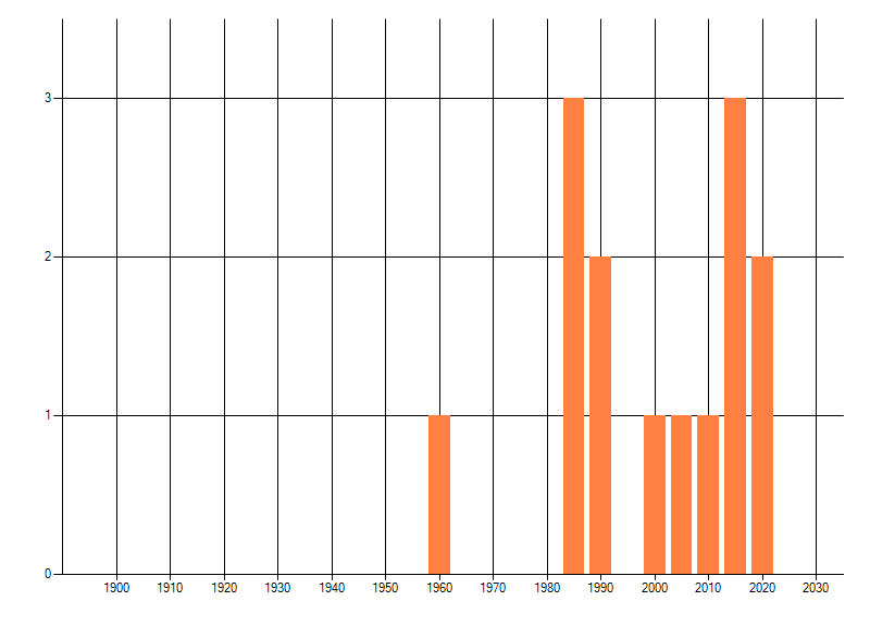 Het aantal atlasblokken (5x5 km) waarin de soort is gemeld binnen een periode van vijf jaar (vanaf 1980) of twintig jaar. Niet gecorrigeerd voor waarnemersinspanning en het aantal doorgegeven waarnemingen kan sterk variëren per periode, dus een trend in verspreiding kan hier niet direct uit worden afgelezen. Het opgegeven jaartal is het eerste jaar van de periode. Bron: gevalideerde waarnemingen uit de NDFF.