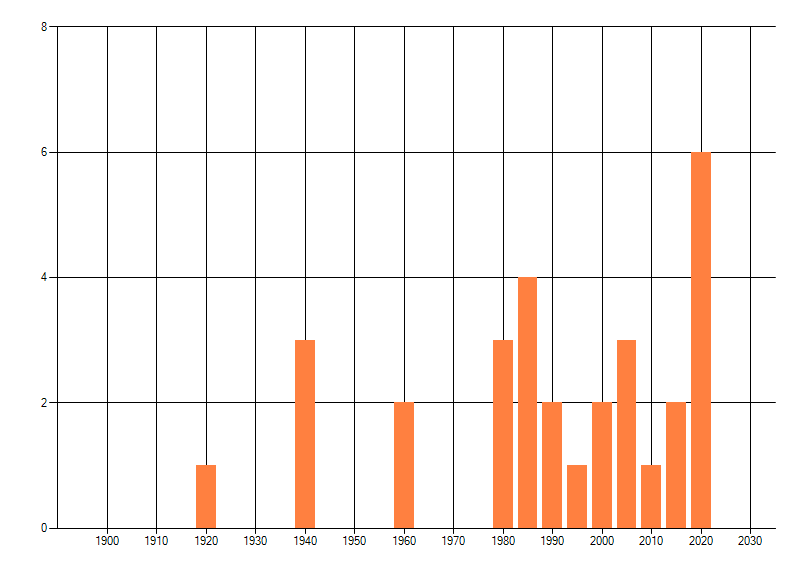 Het aantal atlasblokken (5x5 km) waarin de soort is gemeld binnen een periode van vijf jaar (vanaf 1980) of twintig jaar. Niet gecorrigeerd voor waarnemersinspanning en het aantal doorgegeven waarnemingen kan sterk variëren per periode, dus een trend in verspreiding kan hier niet direct uit worden afgelezen. Het opgegeven jaartal is het eerste jaar van de periode. Bron: gevalideerde waarnemingen uit de NDFF.