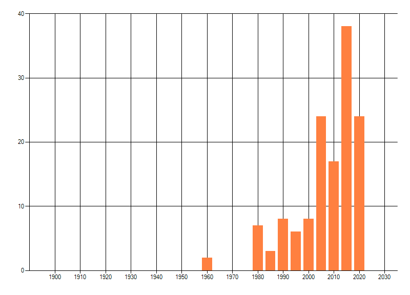 Het aantal atlasblokken (5x5 km) waarin de soort is gemeld binnen een periode van vijf jaar (vanaf 1980) of twintig jaar. Niet gecorrigeerd voor waarnemersinspanning en het aantal doorgegeven waarnemingen kan sterk variëren per periode, dus een trend in verspreiding kan hier niet direct uit worden afgelezen. Het opgegeven jaartal is het eerste jaar van de periode. Bron: gevalideerde waarnemingen uit de NDFF.