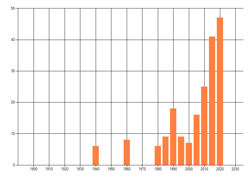 Het aantal atlasblokken (5x5 km) waarin de soort is gemeld binnen een periode van vijf jaar (vanaf 1980) of twintig jaar. Niet gecorrigeerd voor waarnemersinspanning en het aantal doorgegeven waarnemingen kan sterk variëren per periode, dus een trend in verspreiding kan hier niet direct uit worden afgelezen. Het opgegeven jaartal is het eerste jaar van de periode. Bron: gevalideerde waarnemingen uit de NDFF.