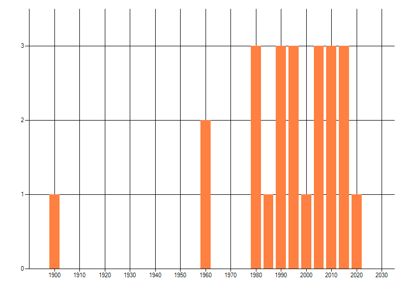 Het aantal atlasblokken (5x5 km) waarin de soort is gemeld binnen een periode van vijf jaar (vanaf 1980) of twintig jaar. Niet gecorrigeerd voor waarnemersinspanning en het aantal doorgegeven waarnemingen kan sterk variëren per periode, dus een trend in verspreiding kan hier niet direct uit worden afgelezen. Het opgegeven jaartal is het eerste jaar van de periode. Bron: gevalideerde waarnemingen uit de NDFF.