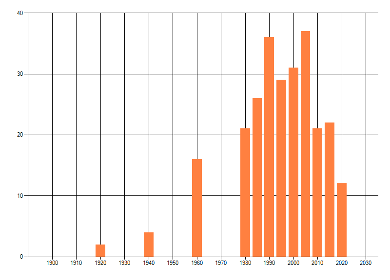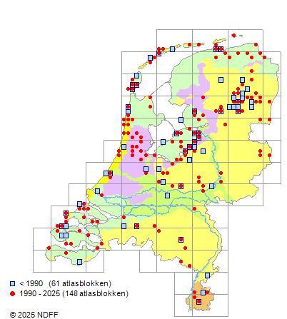 Het aantal atlasblokken (5x5 km) waarin de soort is gemeld binnen een periode van vijf jaar (vanaf 1980) of twintig jaar. Niet gecorrigeerd voor waarnemersinspanning en het aantal doorgegeven waarnemingen kan sterk variëren per periode, dus een trend in verspreiding kan hier niet direct uit worden afgelezen. Het opgegeven jaartal is het eerste jaar van de periode. Bron: gevalideerde waarnemingen uit de NDFF.