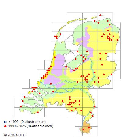 Het aantal atlasblokken (5x5 km) waarin de soort is gemeld binnen een periode van vijf jaar (vanaf 1980) of twintig jaar. Niet gecorrigeerd voor waarnemersinspanning en het aantal doorgegeven waarnemingen kan sterk variëren per periode, dus een trend in verspreiding kan hier niet direct uit worden afgelezen. Het opgegeven jaartal is het eerste jaar van de periode. Bron: gevalideerde waarnemingen uit de NDFF.