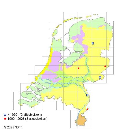 Het aantal atlasblokken (5x5 km) waarin de soort is gemeld binnen een periode van vijf jaar (vanaf 1980) of twintig jaar. Niet gecorrigeerd voor waarnemersinspanning en het aantal doorgegeven waarnemingen kan sterk variëren per periode, dus een trend in verspreiding kan hier niet direct uit worden afgelezen. Het opgegeven jaartal is het eerste jaar van de periode. Bron: gevalideerde waarnemingen uit de NDFF.