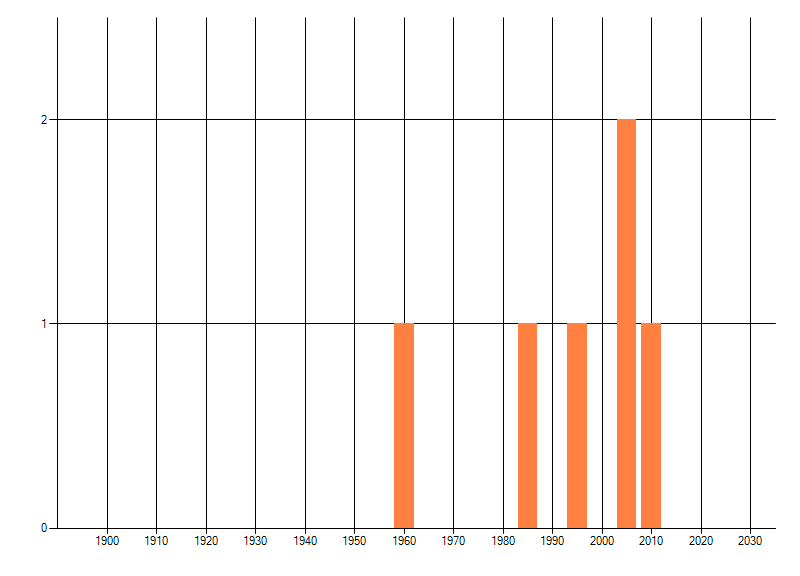 Het aantal atlasblokken (5x5 km) waarin de soort is gemeld binnen een periode van vijf jaar (vanaf 1980) of twintig jaar. Niet gecorrigeerd voor waarnemersinspanning en het aantal doorgegeven waarnemingen kan sterk variëren per periode, dus een trend in verspreiding kan hier niet direct uit worden afgelezen. Het opgegeven jaartal is het eerste jaar van de periode. Bron: gevalideerde waarnemingen uit de NDFF.