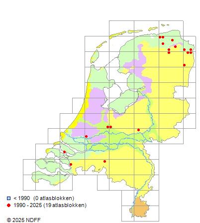Het aantal atlasblokken (5x5 km) waarin de soort is gemeld binnen een periode van vijf jaar (vanaf 1980) of twintig jaar. Niet gecorrigeerd voor waarnemersinspanning en het aantal doorgegeven waarnemingen kan sterk variëren per periode, dus een trend in verspreiding kan hier niet direct uit worden afgelezen. Het opgegeven jaartal is het eerste jaar van de periode. Bron: gevalideerde waarnemingen uit de NDFF.