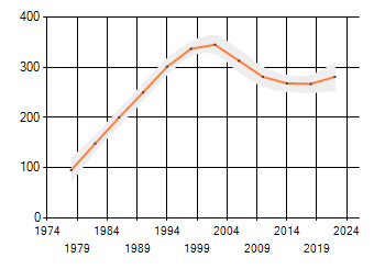 Gemiddelde trend van het aantal kilometerhokken waarin de soort voorkomt, weergegeven als indexcijfer (1975-1978 = 100). De trend is gecorrigeerd voor waarnemersinspanning en geeft de relatieve verandering in het aantal bezette kilometerhokken weer. Voor de berekening worden de data per periode van vier jaar samengenomen. In de grafiek correspondeert ieder punt met het laatste jaar van zo'n periode.