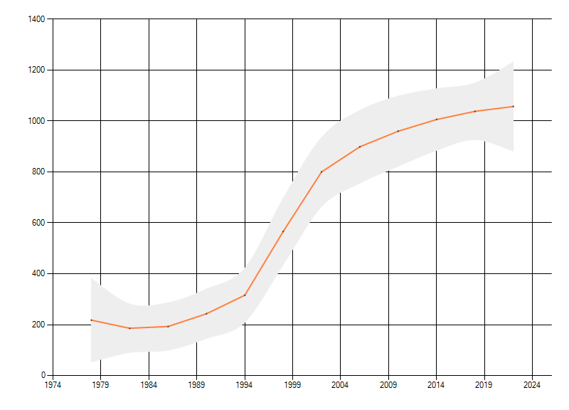 In de grafiek correspondeert ieder punt met het laatste jaar van zo'n periode.