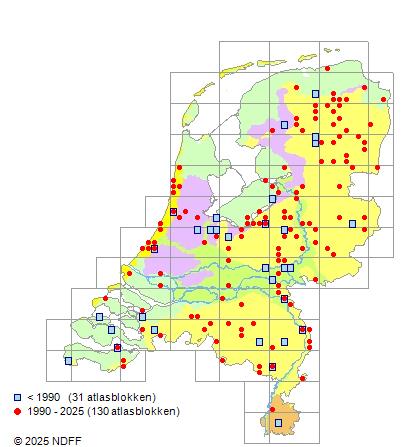 Het aantal atlasblokken (5x5 km) waarin de soort is gemeld binnen een periode van vijf jaar (vanaf 1980) of twintig jaar. Niet gecorrigeerd voor waarnemersinspanning en het aantal doorgegeven waarnemingen kan sterk variëren per periode, dus een trend in verspreiding kan hier niet direct uit worden afgelezen. Het opgegeven jaartal is het eerste jaar van de periode. Bron: gevalideerde waarnemingen uit de NDFF.