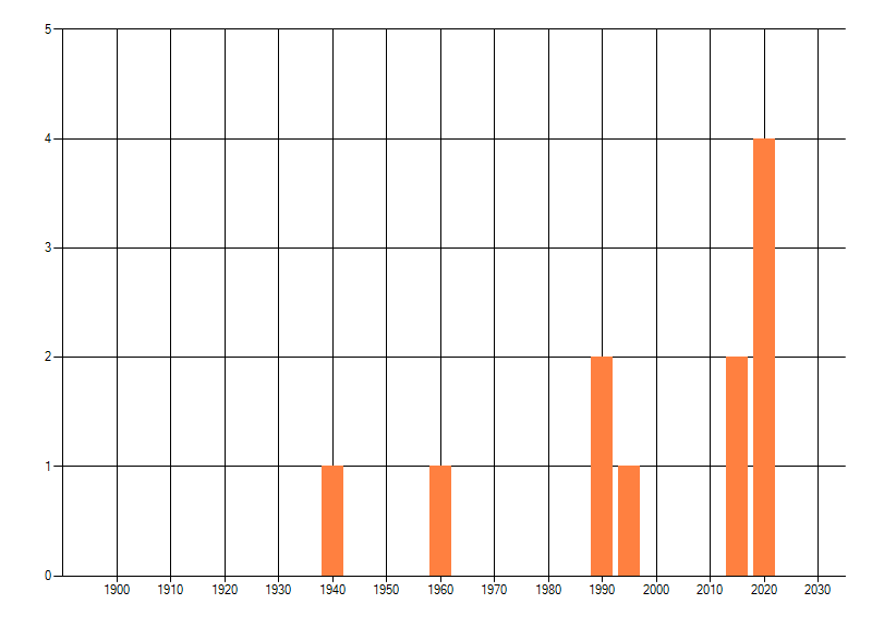 Het aantal atlasblokken (5x5 km) waarin de soort is gemeld binnen een periode van vijf jaar (vanaf 1980) of twintig jaar. Niet gecorrigeerd voor waarnemersinspanning en het aantal doorgegeven waarnemingen kan sterk variëren per periode, dus een trend in verspreiding kan hier niet direct uit worden afgelezen. Het opgegeven jaartal is het eerste jaar van de periode. Bron: gevalideerde waarnemingen uit de NDFF.