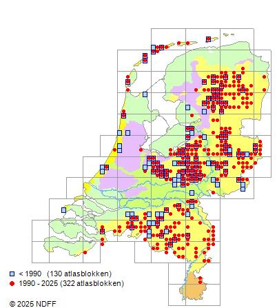 Het aantal atlasblokken (5x5 km) waarin de soort is gemeld binnen een periode van vijf jaar (vanaf 1980) of twintig jaar. Niet gecorrigeerd voor waarnemersinspanning en het aantal doorgegeven waarnemingen kan sterk variëren per periode, dus een trend in verspreiding kan hier niet direct uit worden afgelezen. Het opgegeven jaartal is het eerste jaar van de periode. Bron: gevalideerde waarnemingen uit de NDFF.