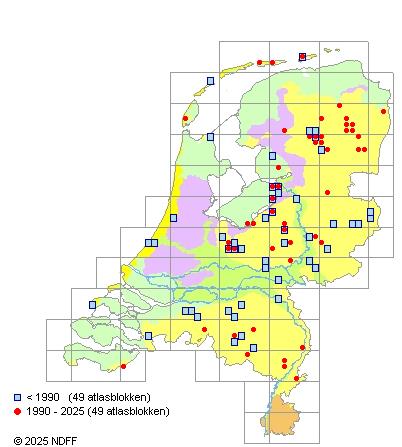 Vroeger vrij zeld., in P, R, W en Y; zeer zeld. in F. Sterk achteruitgegaan en thans zeer zeld. Kaart in Nauta & Vellinga, Atlas. 1995.