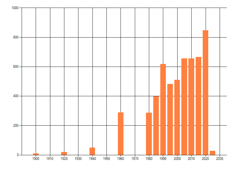 Het aantal atlasblokken (5x5 km) waarin de soort is gemeld binnen een periode van vijf jaar (vanaf 1980) of twintig jaar. Niet gecorrigeerd voor waarnemersinspanning en het aantal doorgegeven waarnemingen kan sterk variƫren per periode, dus een trend in verspreiding kan hier niet direct uit worden afgelezen. Het opgegeven jaartal is het eerste jaar van de periode. Bron: gevalideerde waarnemingen uit de NDFF.