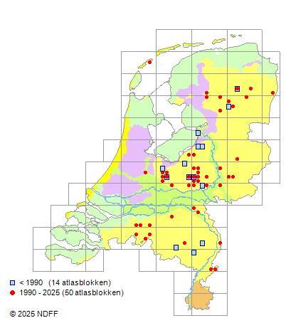 Het aantal atlasblokken (5x5 km) waarin de soort is gemeld binnen een periode van vijf jaar (vanaf 1980) of twintig jaar. Niet gecorrigeerd voor waarnemersinspanning en het aantal doorgegeven waarnemingen kan sterk variëren per periode, dus een trend in verspreiding kan hier niet direct uit worden afgelezen. Het opgegeven jaartal is het eerste jaar van de periode. Bron: gevalideerde waarnemingen uit de NDFF.