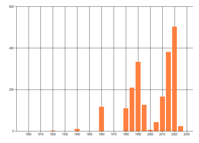 Het aantal atlasblokken (5x5 km) waarin de soort is gemeld binnen een periode van vijf jaar (vanaf 1980) of twintig jaar. Niet gecorrigeerd voor waarnemersinspanning en het aantal doorgegeven waarnemingen kan sterk variëren per periode, dus een trend in verspreiding kan hier niet direct uit worden afgelezen. Het opgegeven jaartal is het eerste jaar van de periode. Bron: gevalideerde waarnemingen uit de NDFF.