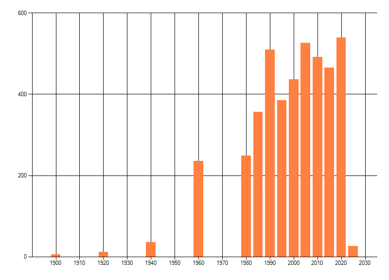 Het aantal atlasblokken (5x5 km) waarin de soort is gemeld binnen een periode van vijf jaar (vanaf 1980) of twintig jaar. Niet gecorrigeerd voor waarnemersinspanning en het aantal doorgegeven waarnemingen kan sterk variëren per periode, dus een trend in verspreiding kan hier niet direct uit worden afgelezen. Het opgegeven jaartal is het eerste jaar van de periode. Bron: gevalideerde waarnemingen uit de NDFF.