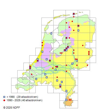 Het aantal atlasblokken (5x5 km) waarin de soort is gemeld binnen een periode van vijf jaar (vanaf 1980) of twintig jaar. Niet gecorrigeerd voor waarnemersinspanning en het aantal doorgegeven waarnemingen kan sterk variëren per periode, dus een trend in verspreiding kan hier niet direct uit worden afgelezen. Het opgegeven jaartal is het eerste jaar van de periode. Bron: gevalideerde waarnemingen uit de NDFF.