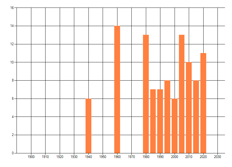Het aantal atlasblokken (5x5 km) waarin de soort is gemeld binnen een periode van vijf jaar (vanaf 1980) of twintig jaar. Niet gecorrigeerd voor waarnemersinspanning en het aantal doorgegeven waarnemingen kan sterk variëren per periode, dus een trend in verspreiding kan hier niet direct uit worden afgelezen. Het opgegeven jaartal is het eerste jaar van de periode. Bron: gevalideerde waarnemingen uit de NDFF.