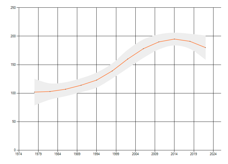 Gemiddelde trend van het aantal kilometerhokken waarin de soort voorkomt, weergegeven als indexcijfer (1975-1978 = 100).