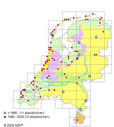 Het aantal atlasblokken (5x5 km) waarin de soort is gemeld binnen een periode van vijf jaar (vanaf 1980) of twintig jaar. Niet gecorrigeerd voor waarnemersinspanning en het aantal doorgegeven waarnemingen kan sterk variëren per periode, dus een trend in verspreiding kan hier niet direct uit worden afgelezen. Het opgegeven jaartal is het eerste jaar van de periode. Bron: gevalideerde waarnemingen uit de NDFF.