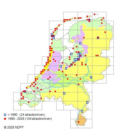 Het aantal atlasblokken (5x5 km) waarin de soort is gemeld binnen een periode van vijf jaar (vanaf 1980) of twintig jaar. Niet gecorrigeerd voor waarnemersinspanning en het aantal doorgegeven waarnemingen kan sterk variëren per periode, dus een trend in verspreiding kan hier niet direct uit worden afgelezen. Het opgegeven jaartal is het eerste jaar van de periode. Bron: gevalideerde waarnemingen uit de NDFF.