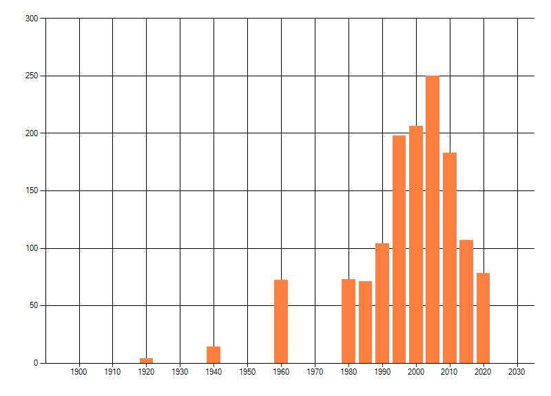 Het aantal atlasblokken (5x5 km) waarin de soort is gemeld binnen een periode van vijf jaar (vanaf 1980) of twintig jaar. Niet gecorrigeerd voor waarnemersinspanning en het aantal doorgegeven waarnemingen kan sterk variëren per periode, dus een trend in verspreiding kan hier niet direct uit worden afgelezen. Het opgegeven jaartal is het eerste jaar van de periode. Bron: gevalideerde waarnemingen uit de NDFF.