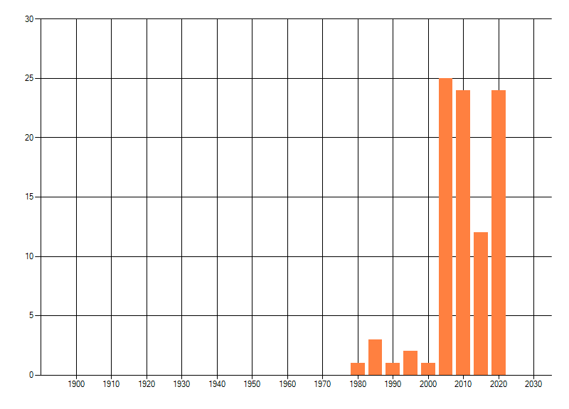 Het aantal atlasblokken (5x5 km) waarin de soort is gemeld binnen een periode van vijf jaar (vanaf 1980) of twintig jaar. Niet gecorrigeerd voor waarnemersinspanning en het aantal doorgegeven waarnemingen kan sterk variëren per periode, dus een trend in verspreiding kan hier niet direct uit worden afgelezen. Het opgegeven jaartal is het eerste jaar van de periode. Bron: gevalideerde waarnemingen uit de NDFF.