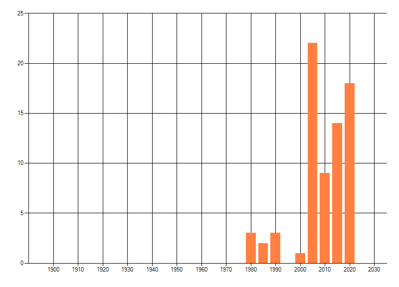 Het aantal atlasblokken (5x5 km) waarin de soort is gemeld binnen een periode van vijf jaar (vanaf 1980) of twintig jaar. Niet gecorrigeerd voor waarnemersinspanning en het aantal doorgegeven waarnemingen kan sterk variëren per periode, dus een trend in verspreiding kan hier niet direct uit worden afgelezen. Het opgegeven jaartal is het eerste jaar van de periode. Bron: gevalideerde waarnemingen uit de NDFF.