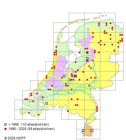 Het aantal atlasblokken (5x5 km) waarin de soort is gemeld binnen een periode van vijf jaar (vanaf 1980) of twintig jaar. Niet gecorrigeerd voor waarnemersinspanning en het aantal doorgegeven waarnemingen kan sterk variëren per periode, dus een trend in verspreiding kan hier niet direct uit worden afgelezen. Het opgegeven jaartal is het eerste jaar van de periode. Bron: gevalideerde waarnemingen uit de NDFF.