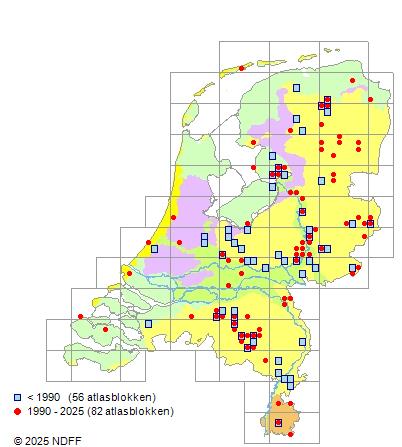 Het aantal atlasblokken (5x5 km) waarin de soort is gemeld binnen een periode van vijf jaar (vanaf 1980) of twintig jaar. Niet gecorrigeerd voor waarnemersinspanning en het aantal doorgegeven waarnemingen kan sterk variëren per periode, dus een trend in verspreiding kan hier niet direct uit worden afgelezen. Het opgegeven jaartal is het eerste jaar van de periode. Bron: gevalideerde waarnemingen uit de NDFF.