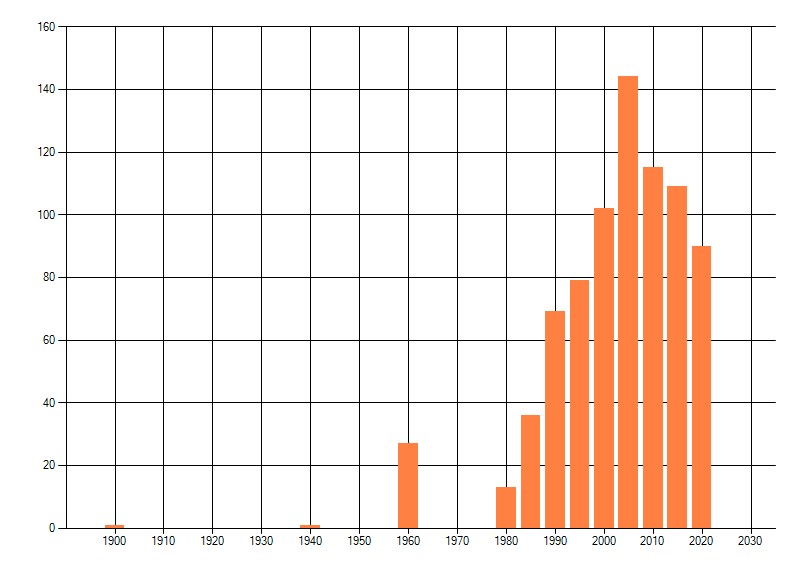 Het aantal atlasblokken (5x5 km) waarin de soort is gemeld binnen een periode van vijf jaar (vanaf 1980) of twintig jaar. Niet gecorrigeerd voor waarnemersinspanning en het aantal doorgegeven waarnemingen kan sterk variëren per periode, dus een trend in verspreiding kan hier niet direct uit worden afgelezen. Het opgegeven jaartal is het eerste jaar van de periode. Bron: gevalideerde waarnemingen uit de NDFF.